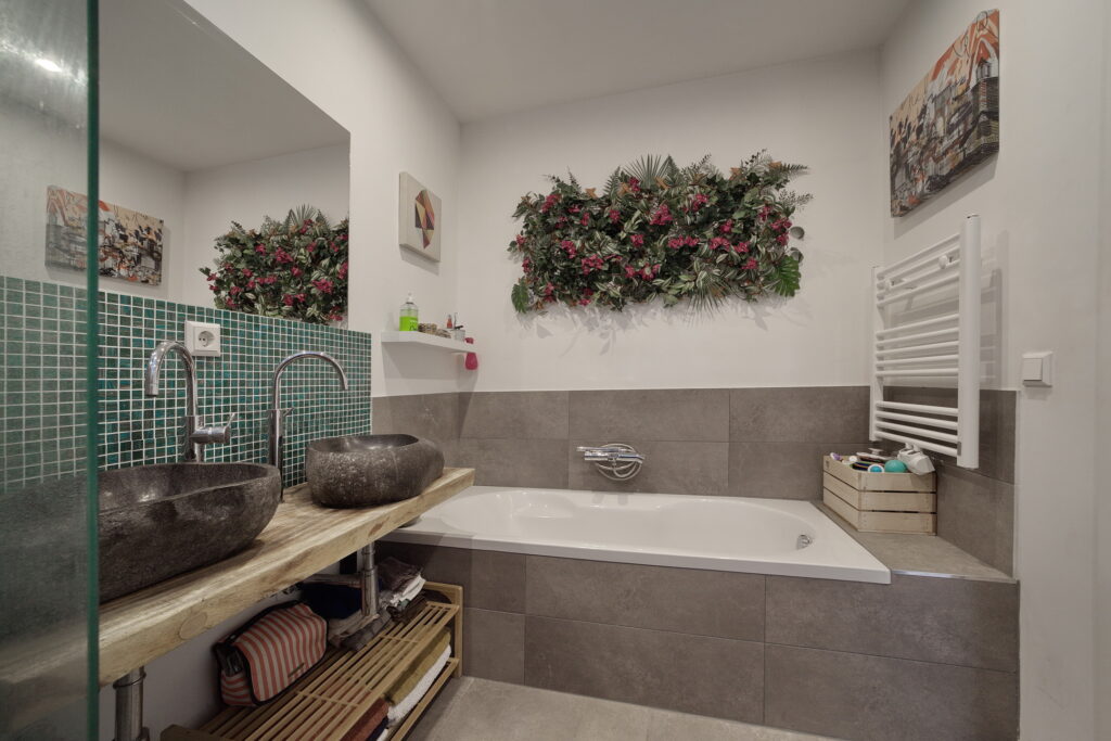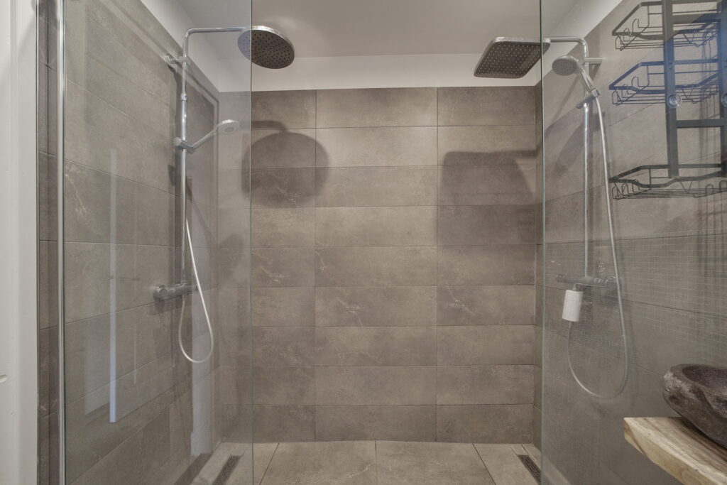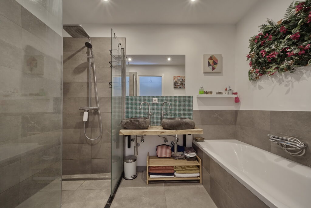 Double doors lead to the living/dining room with a modern open-plan kitchen with built-in appliances. Access to the southeast-facing backyard of approximately 94m² with a garden house and back access. From the hallway, through a wall of built-in wardrobes, access to the bedroom, which also has access to the backyard. Modern bathroom with a bathtub, double walk-in shower, and two sinks.