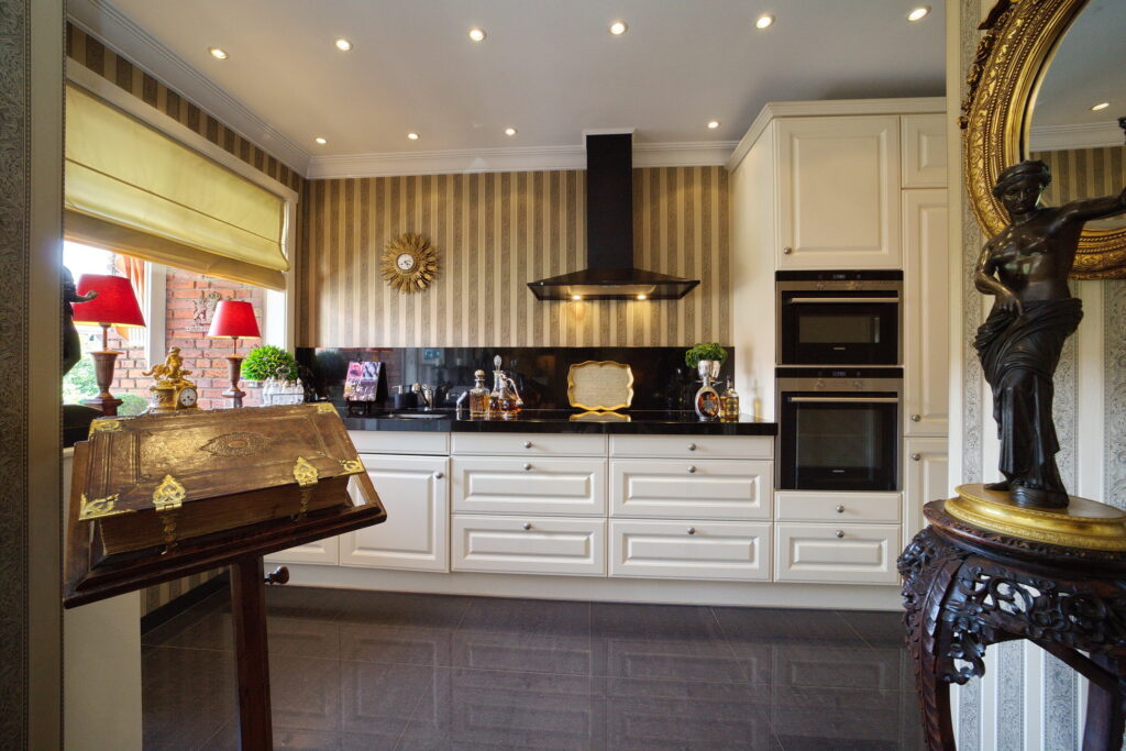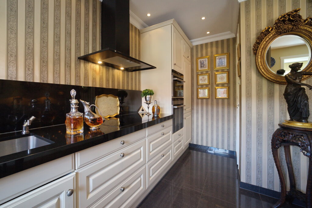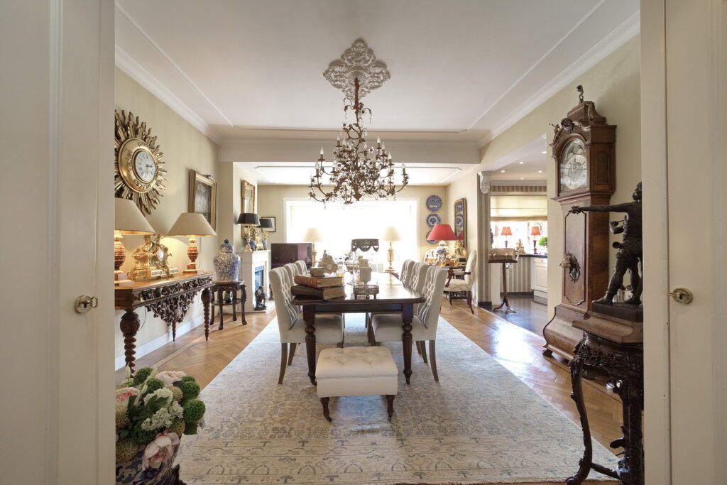 Apartment entrance, vestibule, spacious toilet with hand basin. Square shaped hallway with wardrobe and French doors leading to the ensuite living/dining room with access to the balcony from the living room and from the dining room access to the luxurious open-plan kitchen with built-in appliances and a small kitchen balcony.