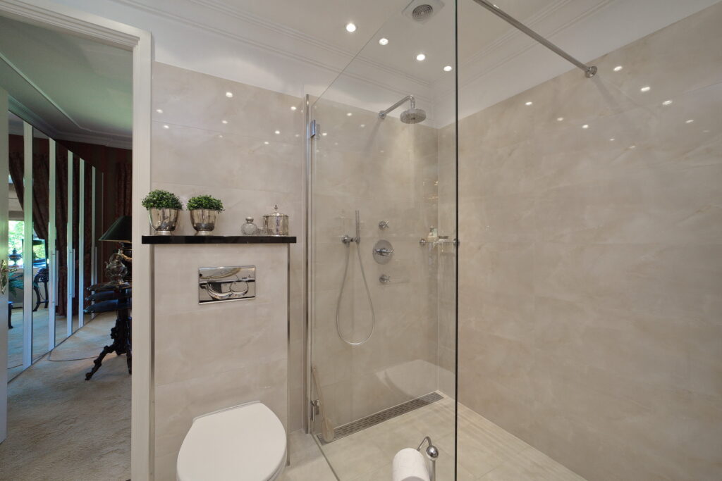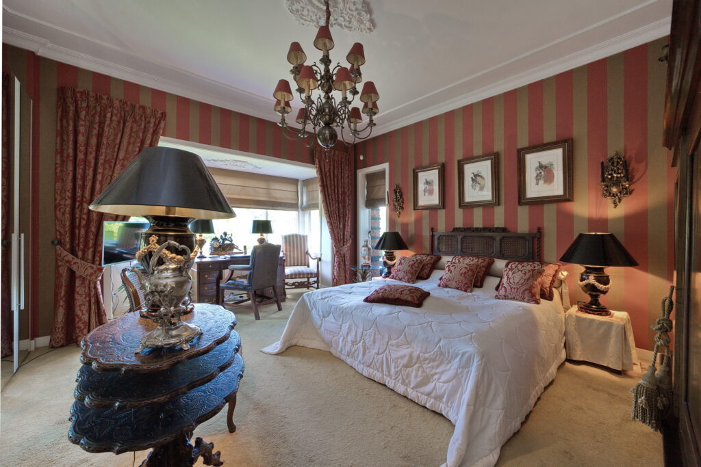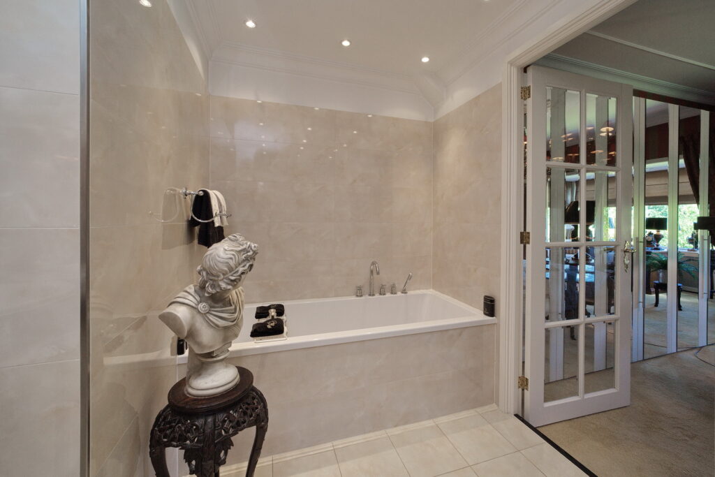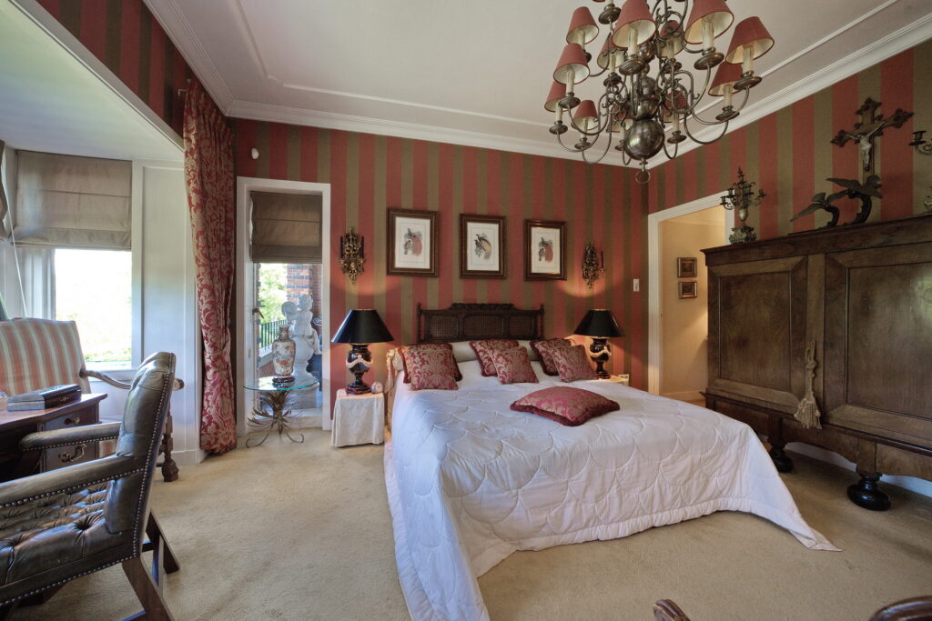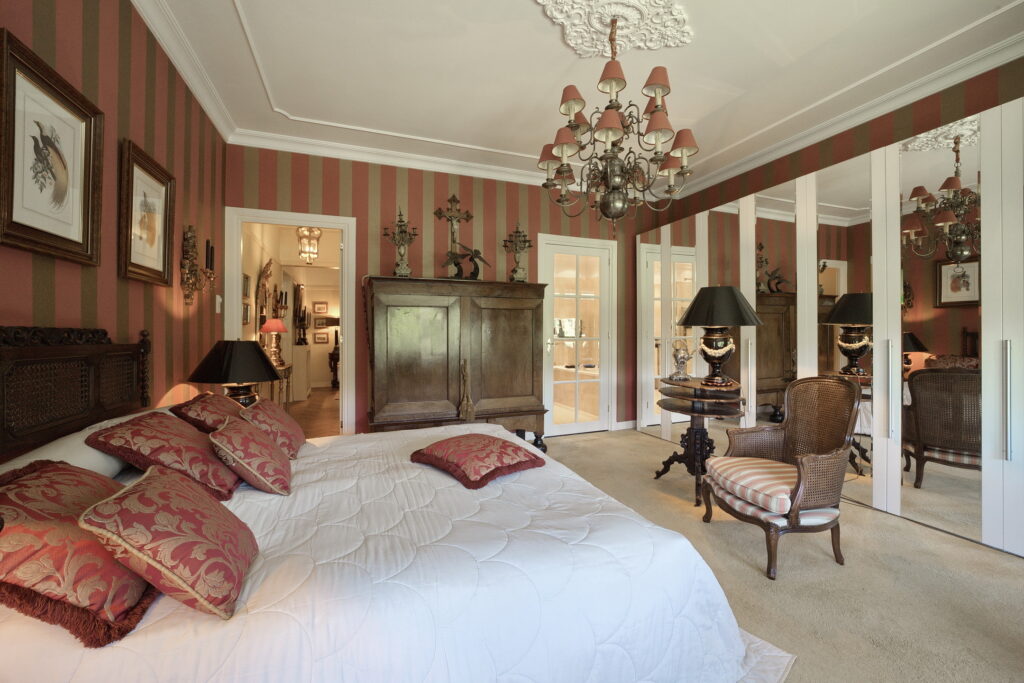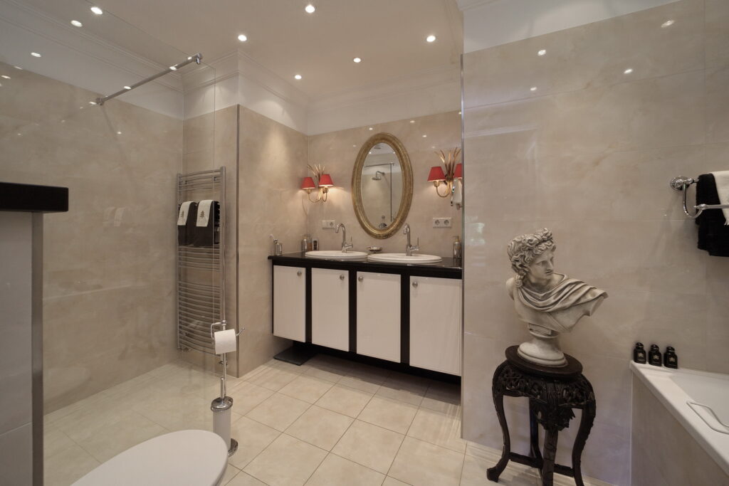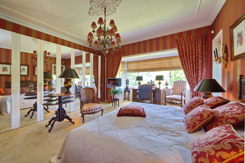 Vanuit de hal ook toegang tot de grote slaapkamer met kastenwand annex de badkamer met bad, inloopdouche, dubbele wastafel in meubel en toilet.
