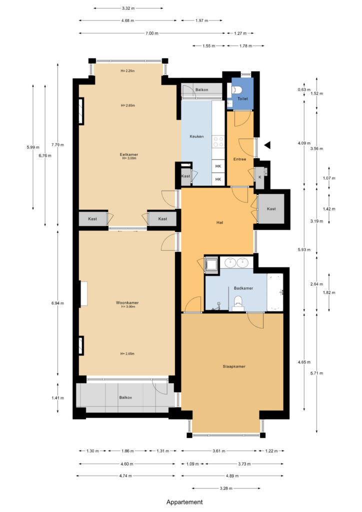 Appartementsentree, vestibule, ruim toilet met fonteintje. Vierkante hal met garderobekast en openslaande deuren naar de woon- eetkamer ensuite met vanuit de woonkamer toegang tot het balkon en vanuit de eetkamer tot de luxe open keuken met inbouwapparatuur en een keukenbalkonnetje.