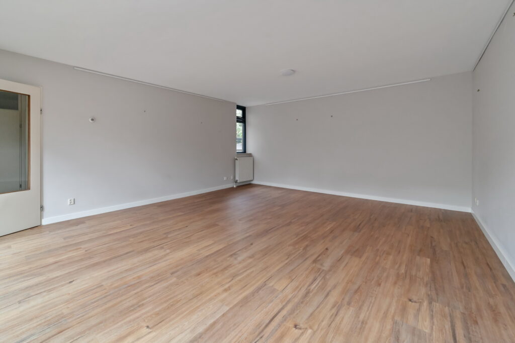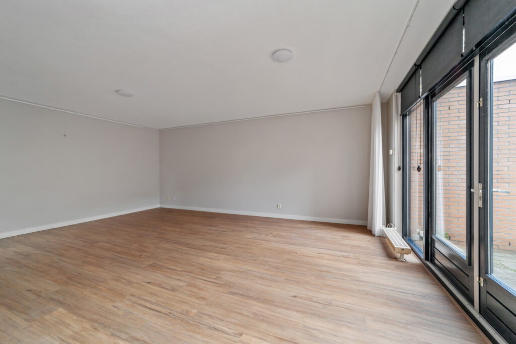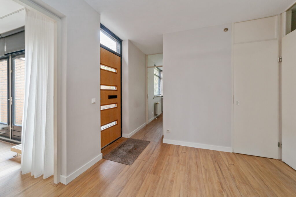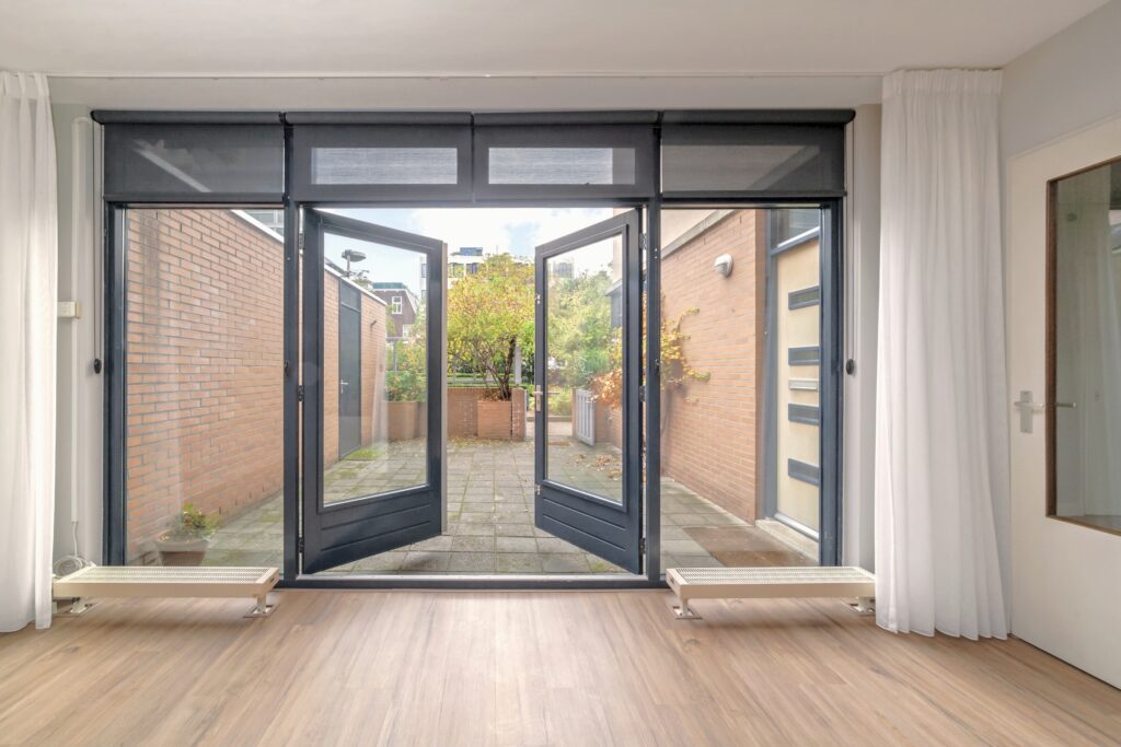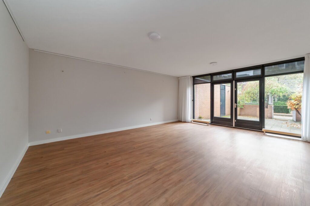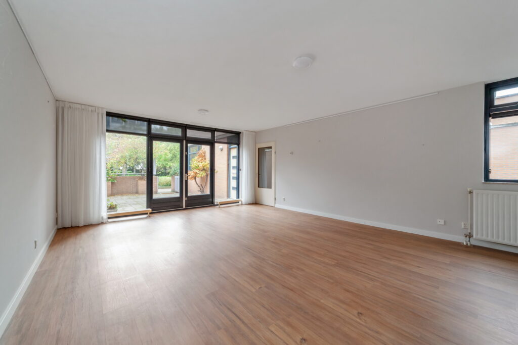 Entree, hal, toilet. Woon- eetkamer met openslaande deuren naar de voortuin.