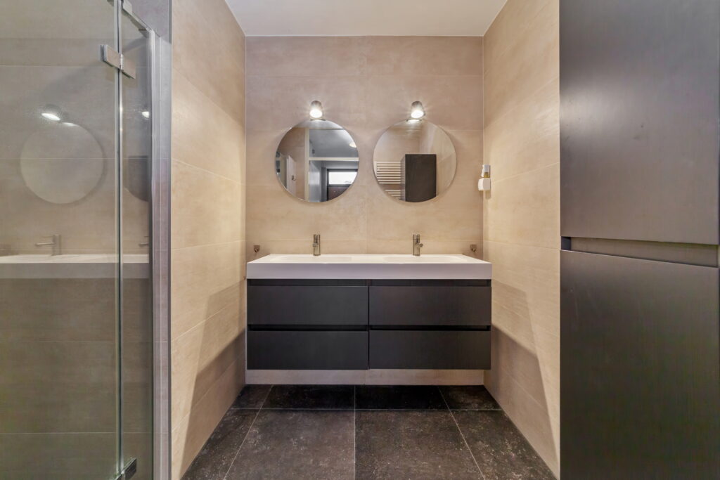Moderne badkamer met inloopdouche en dubbele wastafel in meubel.