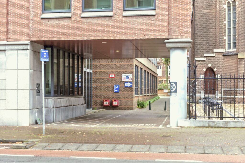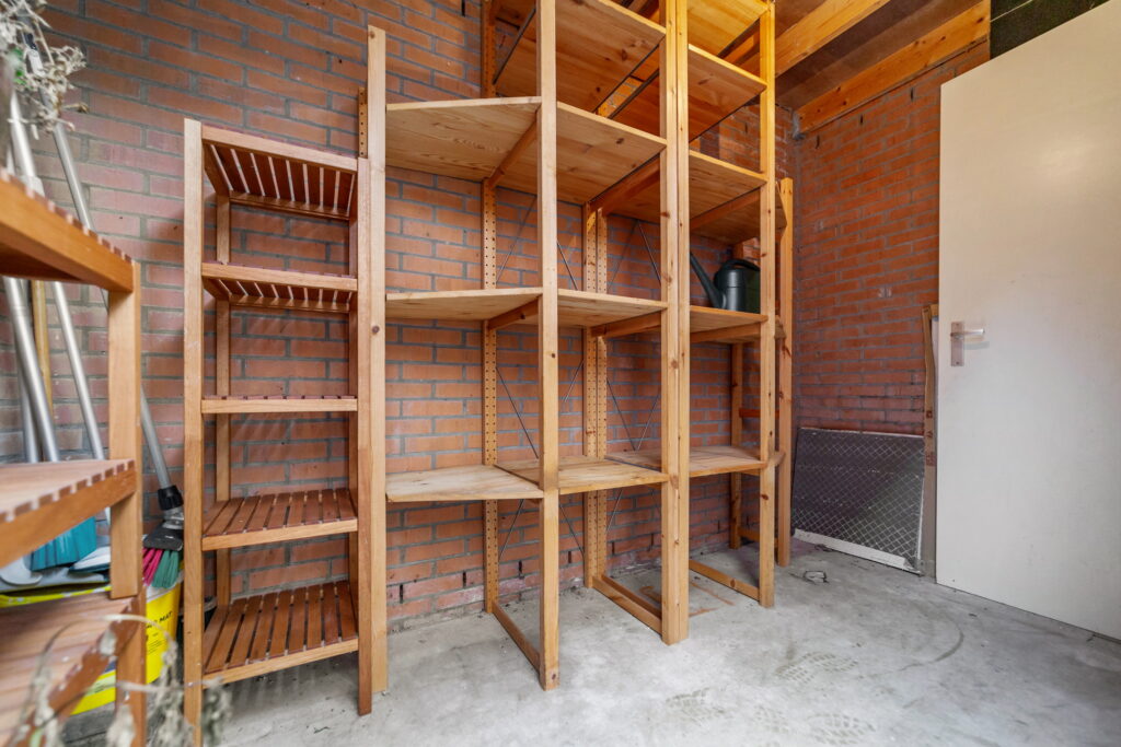 Stenen berging in de voortuin en eigen parkeerplaats in d garage.