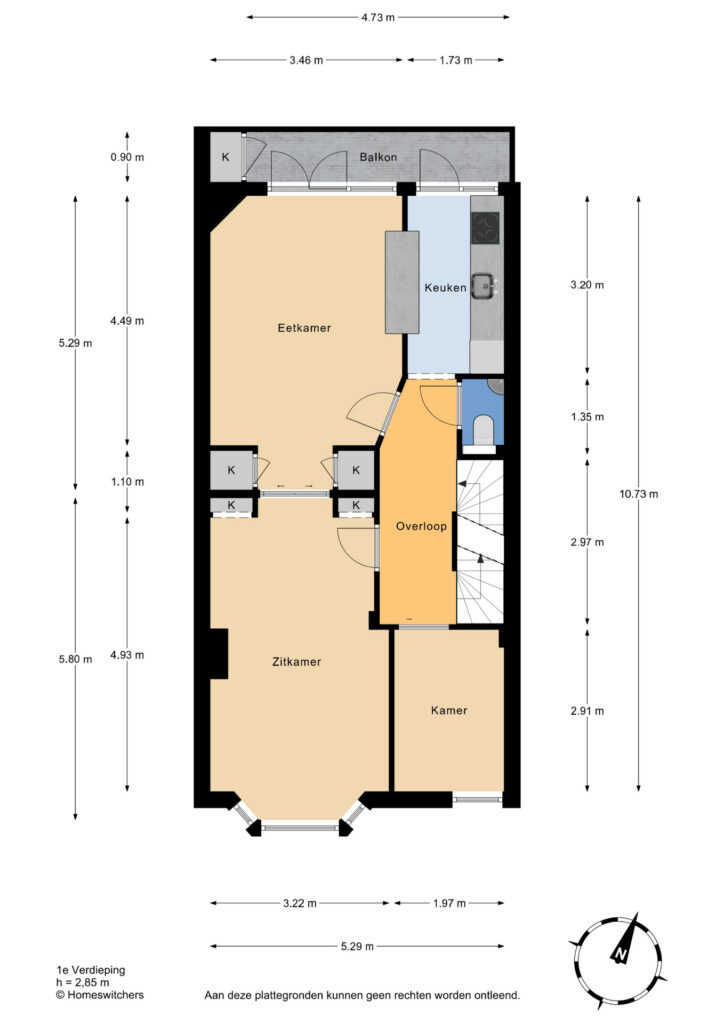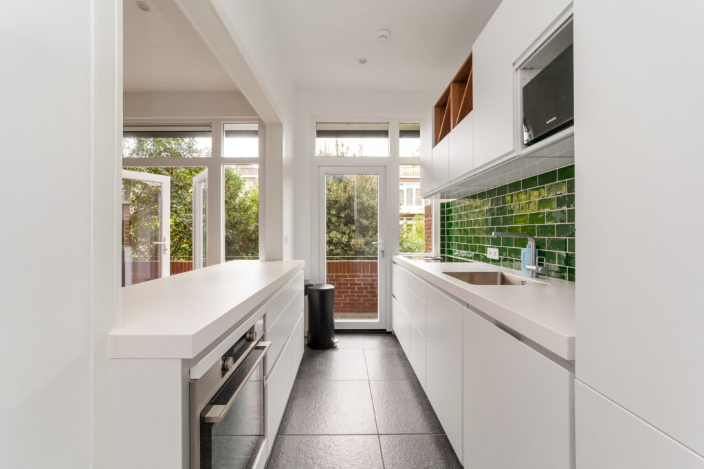 1e etage: Overloop, toilet. Woon- eetkamer ensuite met toegang tot het balkon over de volle breedte aan de achterzijde en de moderne openkeuken met inbouwapparatuur. Voorzijkamer. Deze is kortgeleden afgescheiden