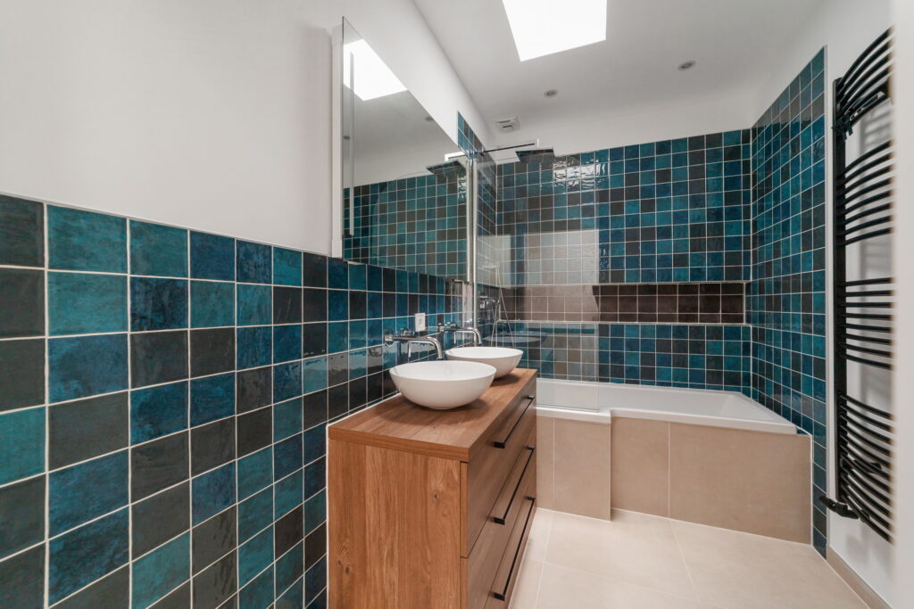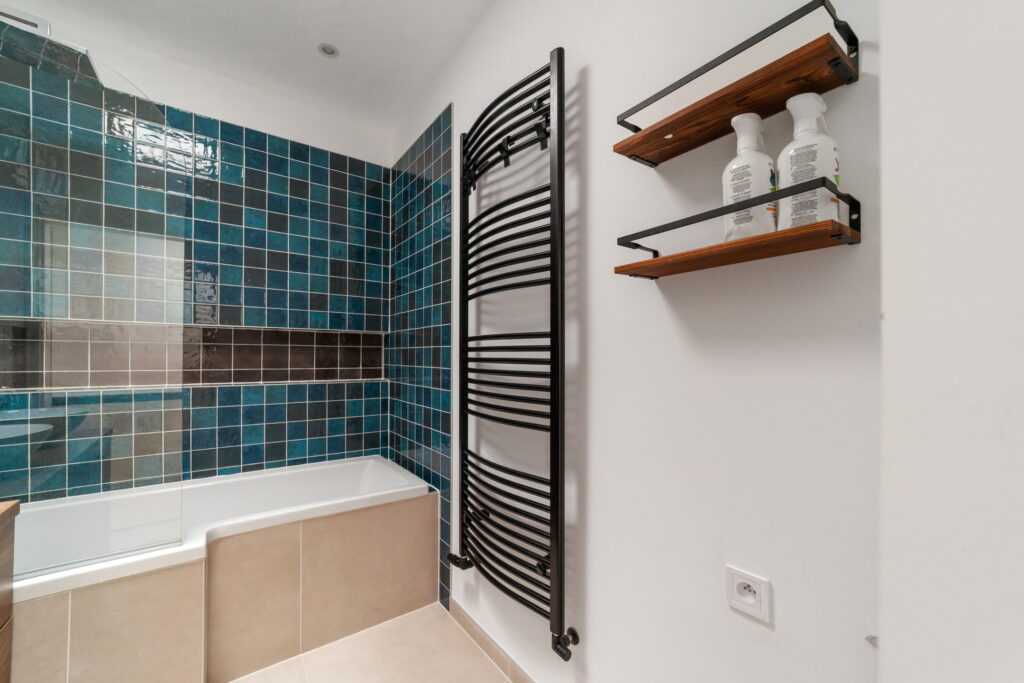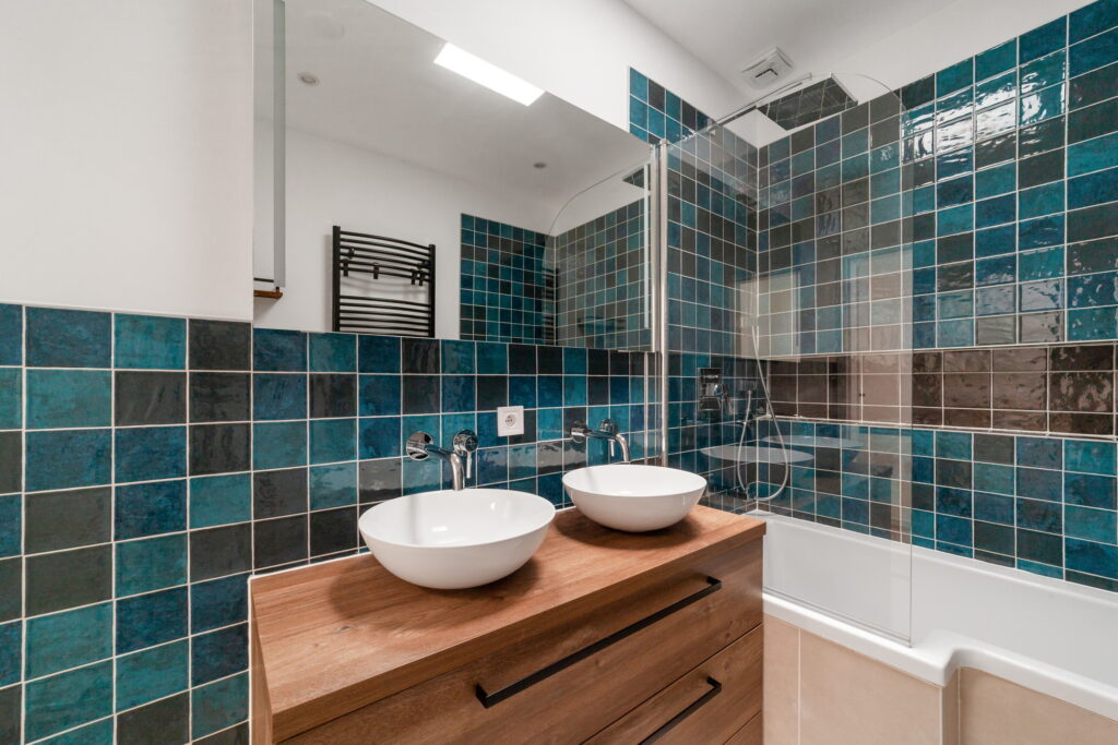 Modern bathroom with bathtub/shower, 2 wash basins in a cupboard and space for laundry appliances. Back room and back side room both with access to the balcony.